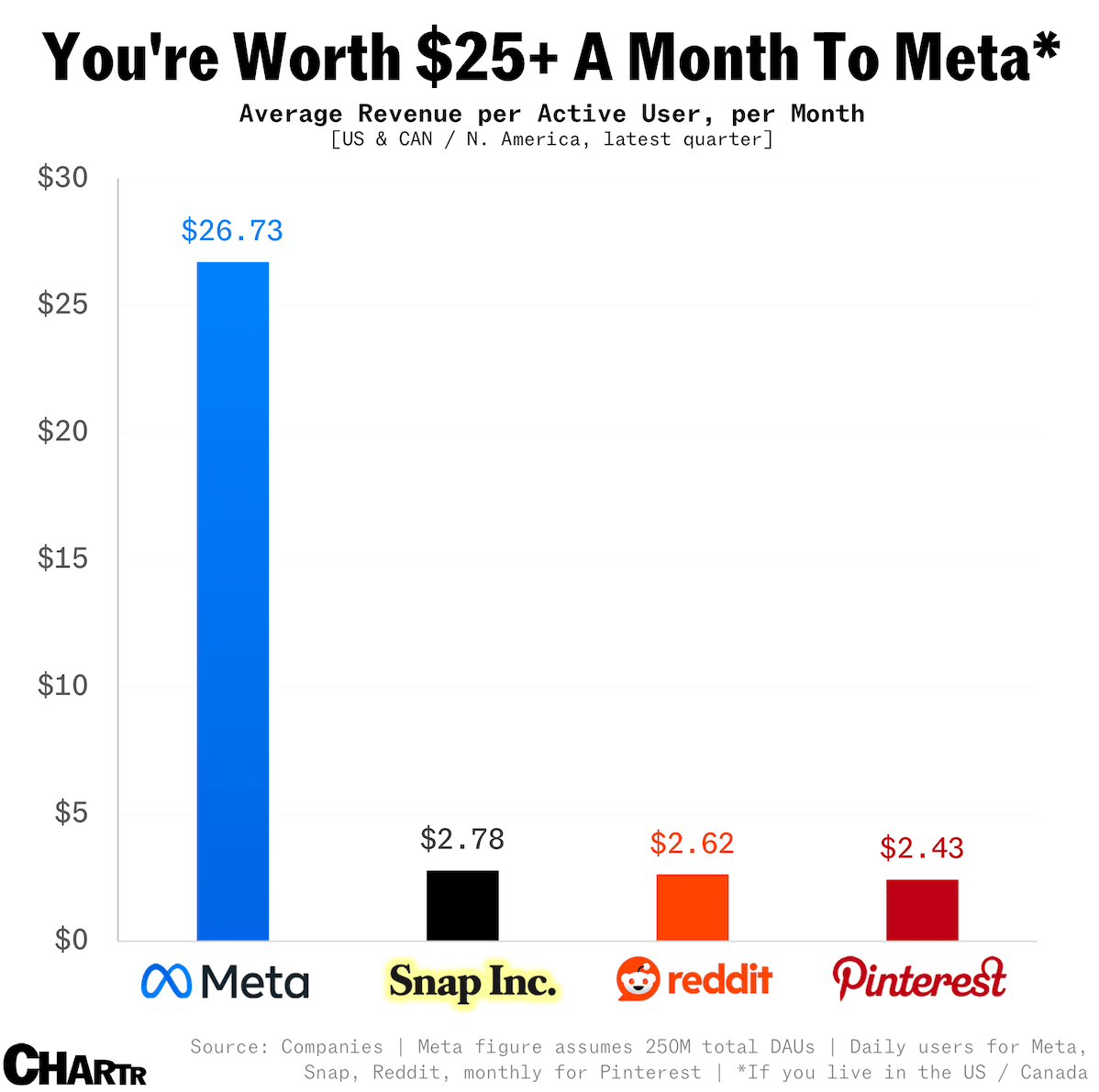 Fiecare utilizator Facebook / Instagram / Threads din Canada & Meta valorează $26 de dolari și 73 de cenți pentru Meta.