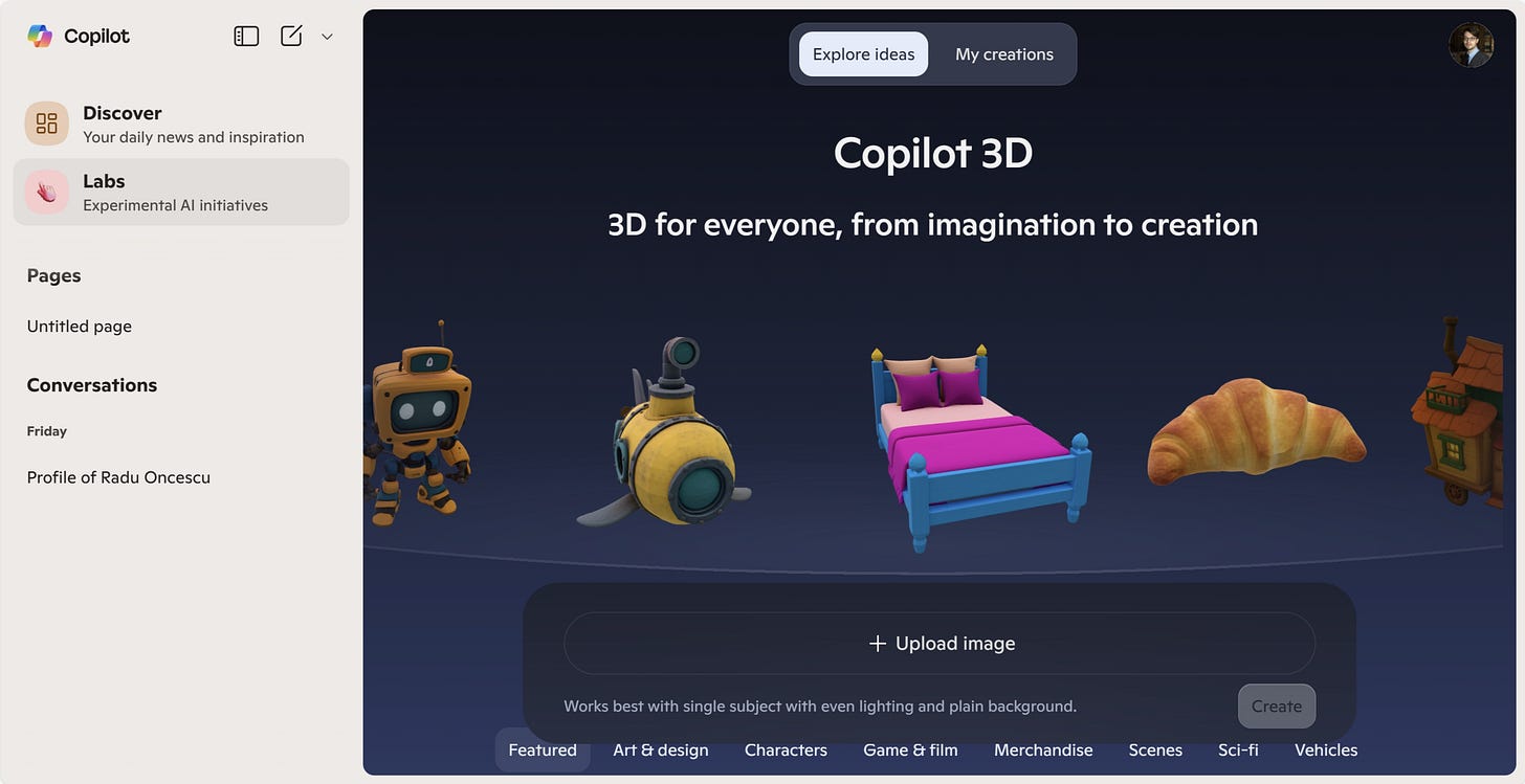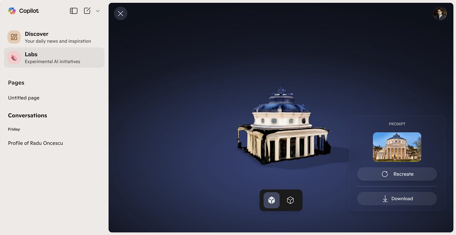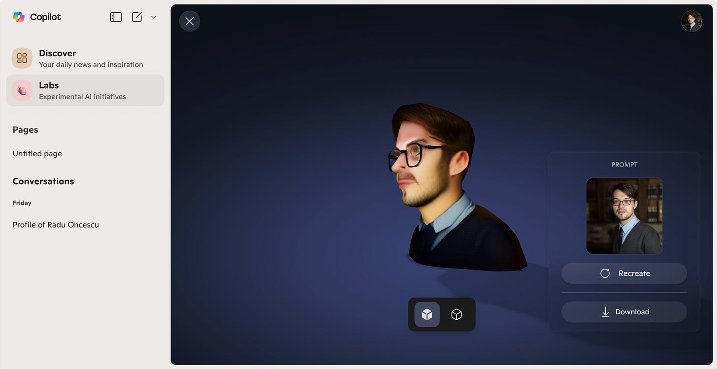 [Microsoft] oferă și utilizatorilor Microsoft Copilot din Uniunea Europeană acces la o nouă opțiune prin MS Copilot Labs, „Copilot 3D”.