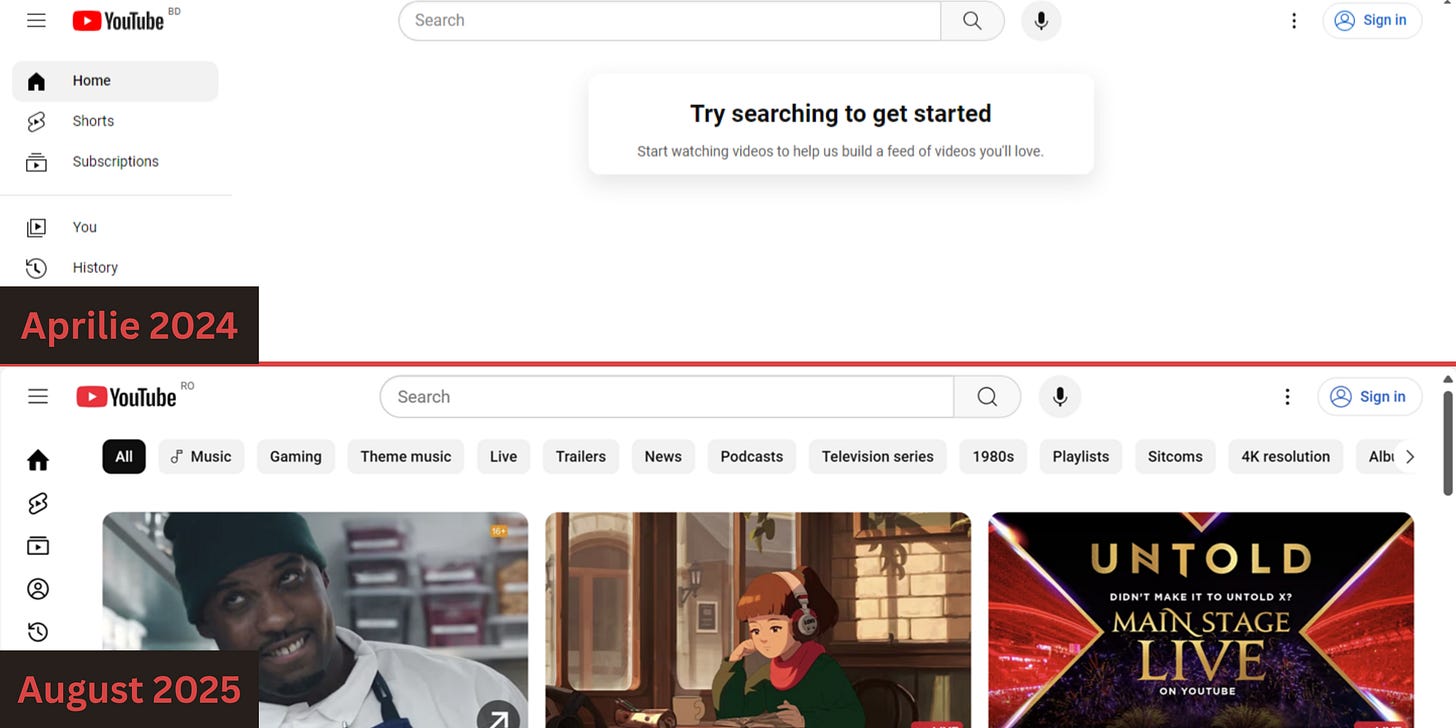 Context: YouTube nu mai recomandă conținut utilizatorilor nelogați din martie-aprilie 2024.