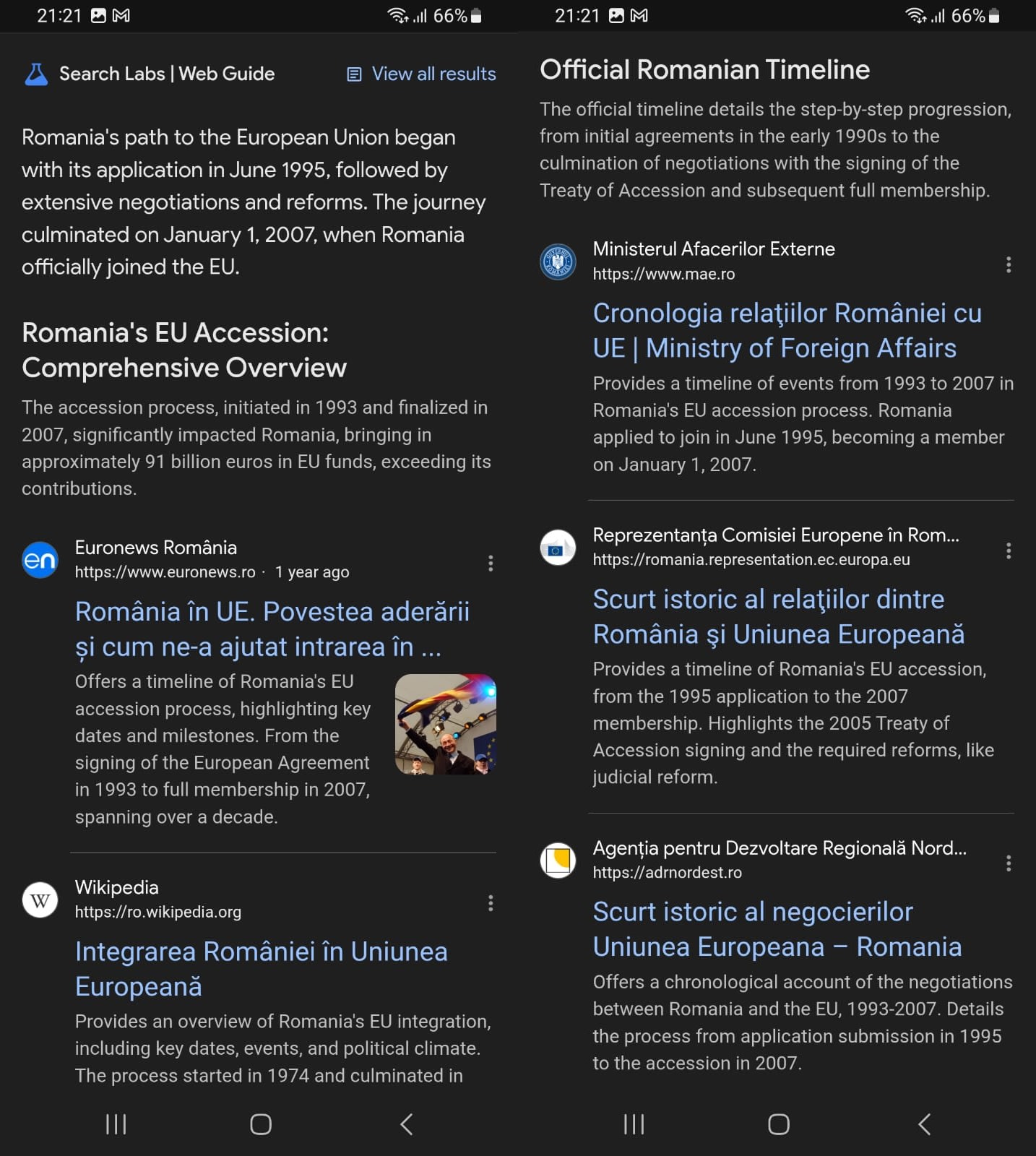 Google, prin această opțiune, structurează mai eficient informațiile livrate utilizatorului de către Google Search pe un anumit subiect, „Romania in the European Union” în cazul de față.