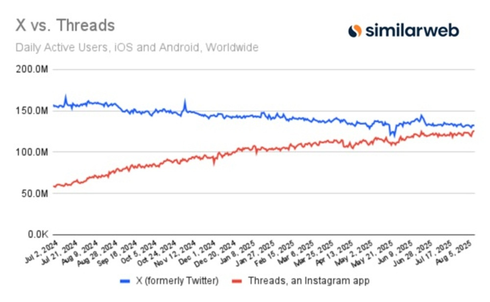 Conform infograficului furnizat de Similar Web, Threads va depăși luna viitoare X la nivel global din punctul de vedere al utilizatorilor activi zilnic.