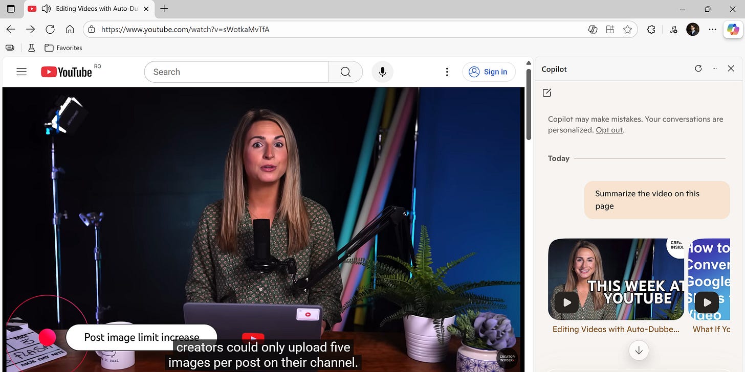 Microsoft afișează în „address bar”-ul browser-ului o nouă opțiune pe bază de AI, „Summarize”, dar este disponibilă doar pentru clipuri.