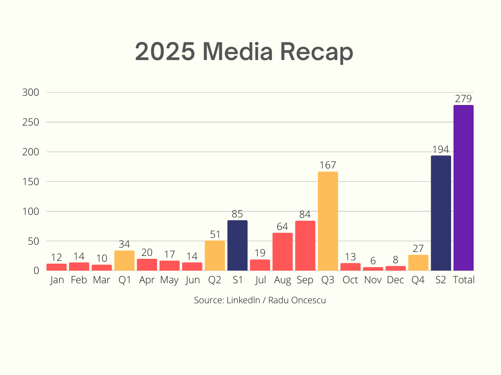 2025 mi-a adus 279 de prezențe media în publicațiile internaționale de specialitate care abordează subiecte din mediul digital (platforme de socializare, search și SEO), publicațiile internaționale generale și publicațiile naționale.