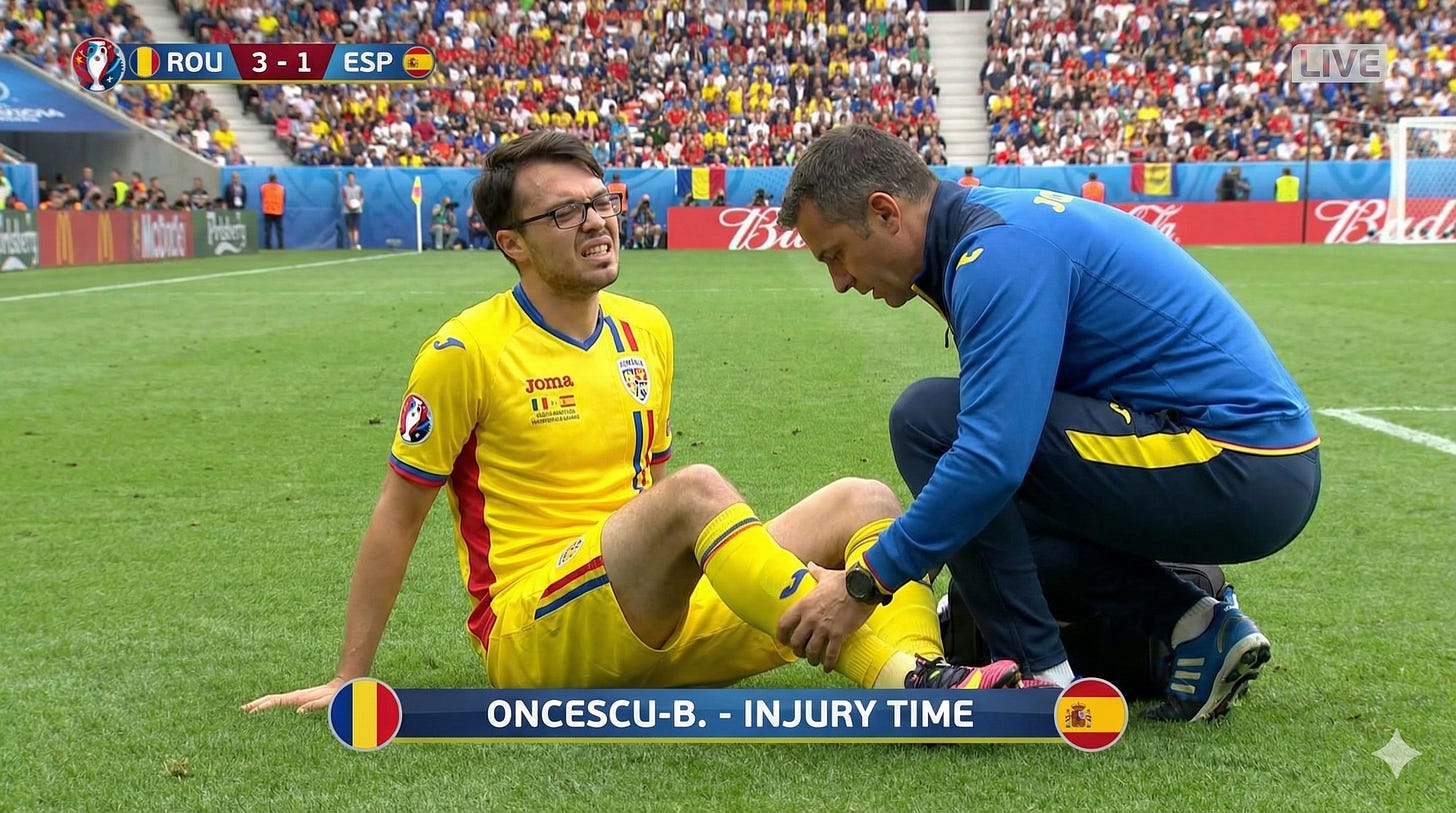 Top Left: A small scoreboard graphic reading “ROU 3 - 1 ESP” with flag icons.Bottom Center: A sleek, glossy broadcast lower-third graphic bar. The text on the bar reads “[NUME]” in large bold font, with a sub-line reading “INJURY TIME”.