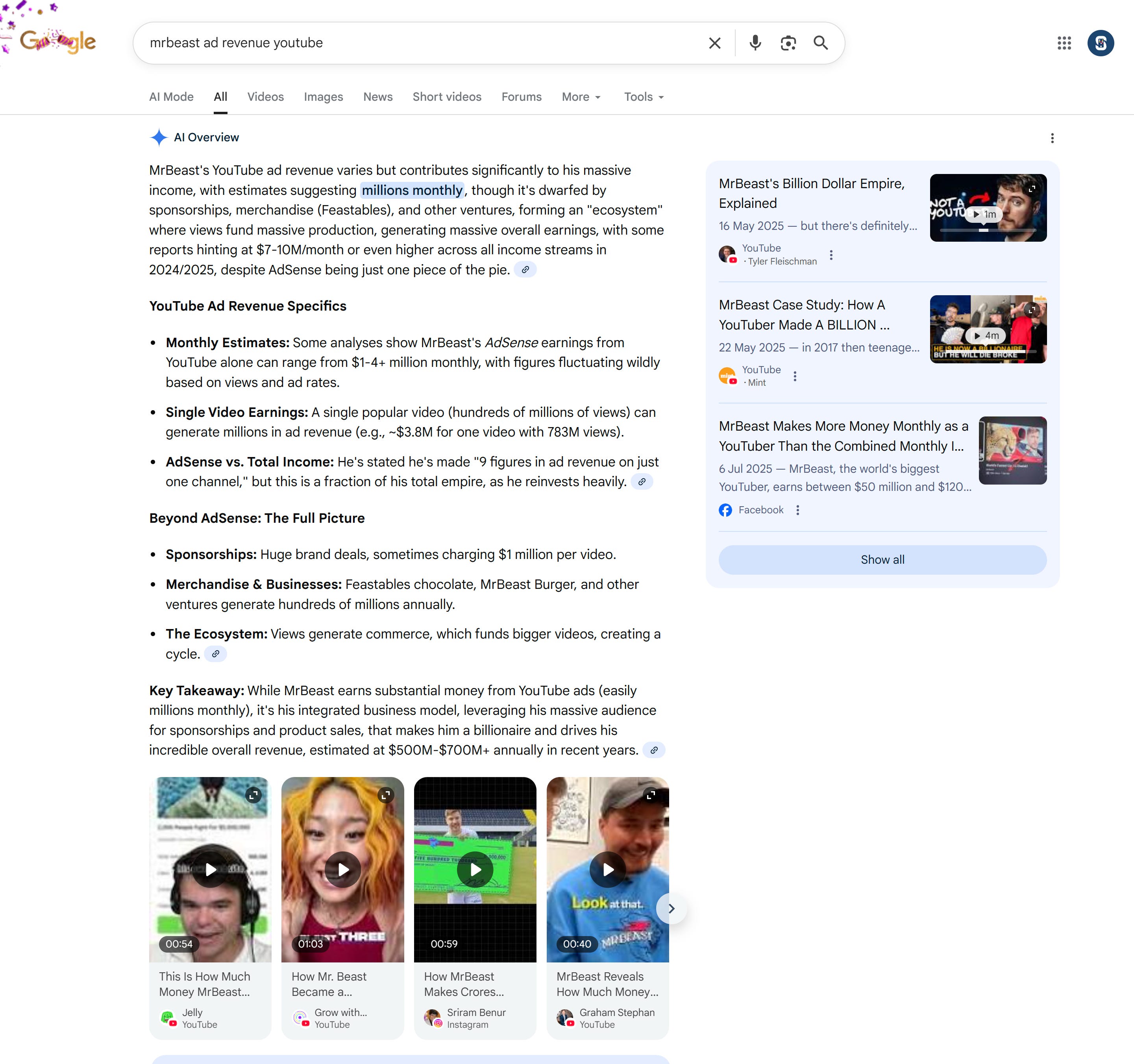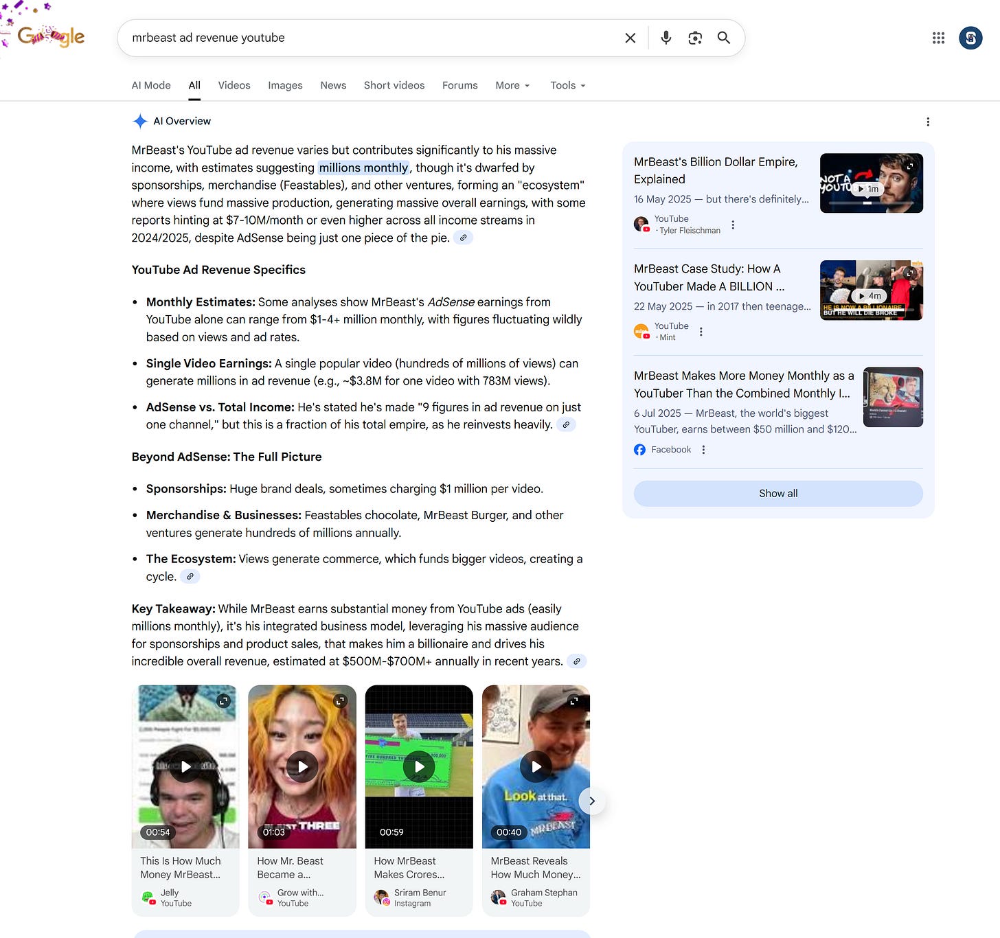 Jimmy Donaldson (Mr. Beast) generează „9 figures in ad revenue” (Google AdSense) pe an din conținutul postat pe principalul cont de YouTube.