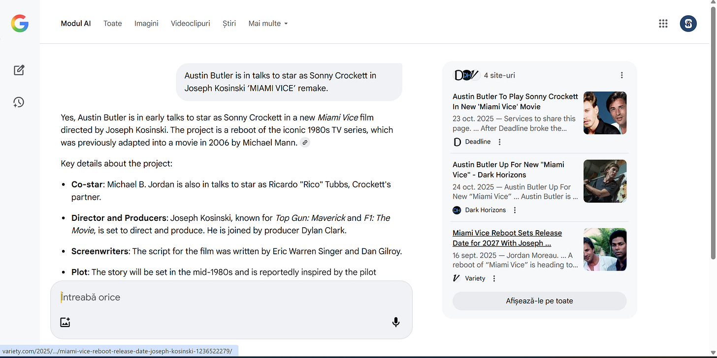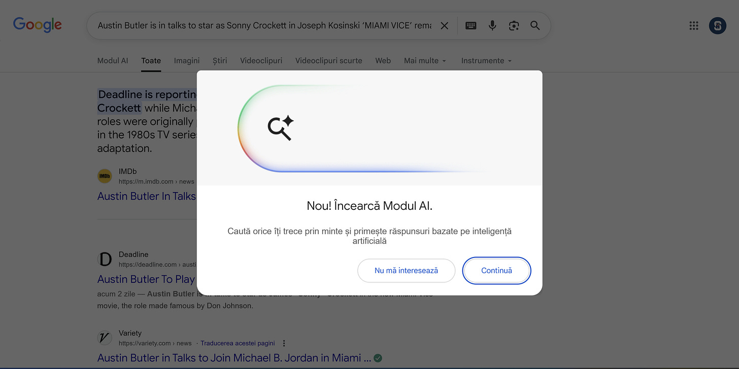 Google promovează Google AI Mode și prin intermediul unui banner care trimite utilizatorul către o căutare efectuată de opțiunea menționată.