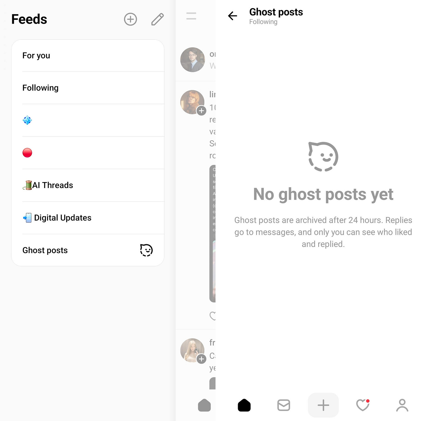 Threads nu oferă un buton pentru acest tip de conținut în post composer, dar un „ghost post” va putea fi creat prin accesarea feed-ului dedicat.