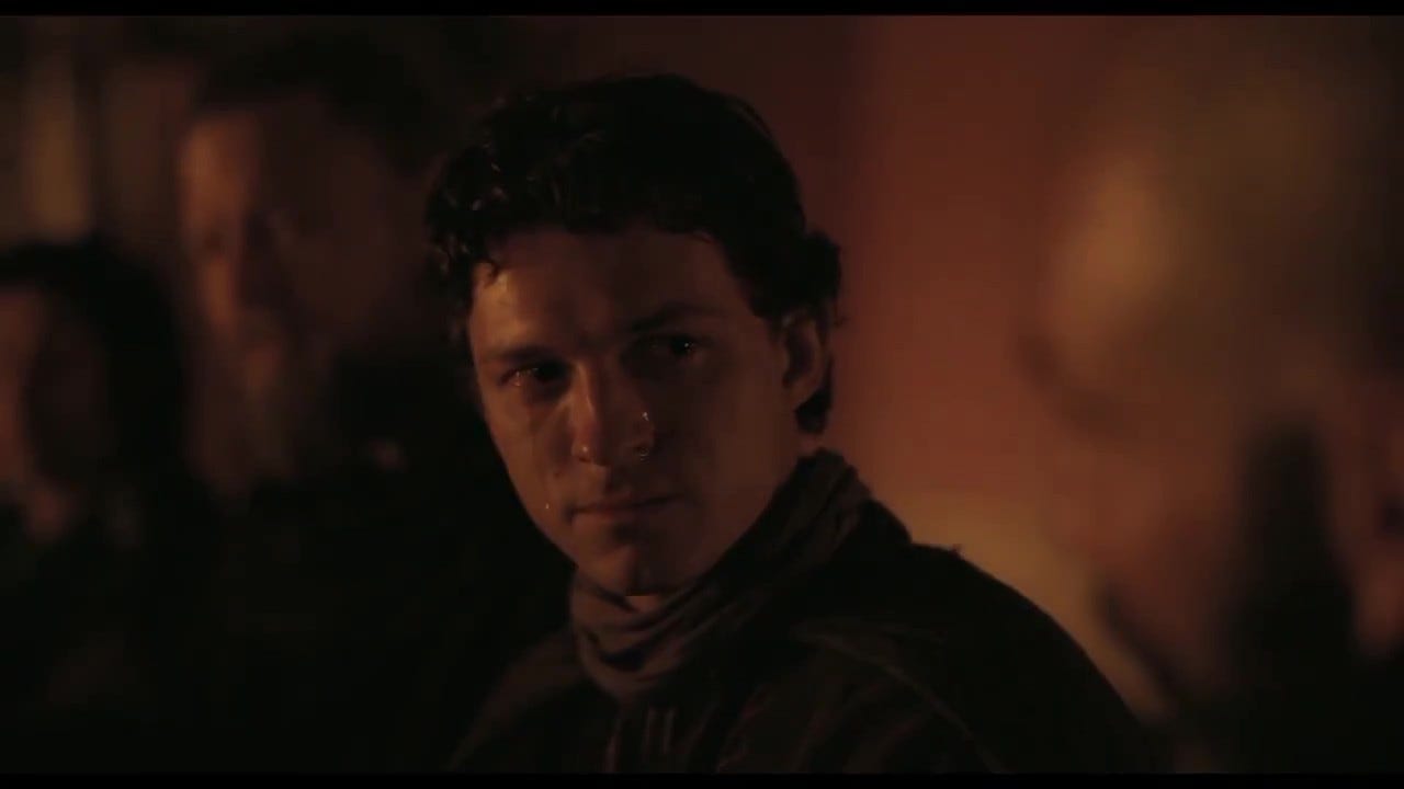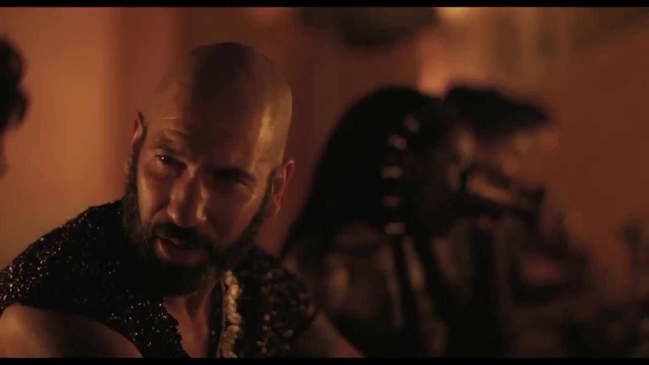 Două capturi de ecran din teaser-ul care rulează în cinematografe pentru filmul „The Oddysey” al lui Christopher Nolan. Aici Jon Bernthal (Regele Nestor) și Tom Holland (Telemachus, fiul lui Ulise și al Penelopei).