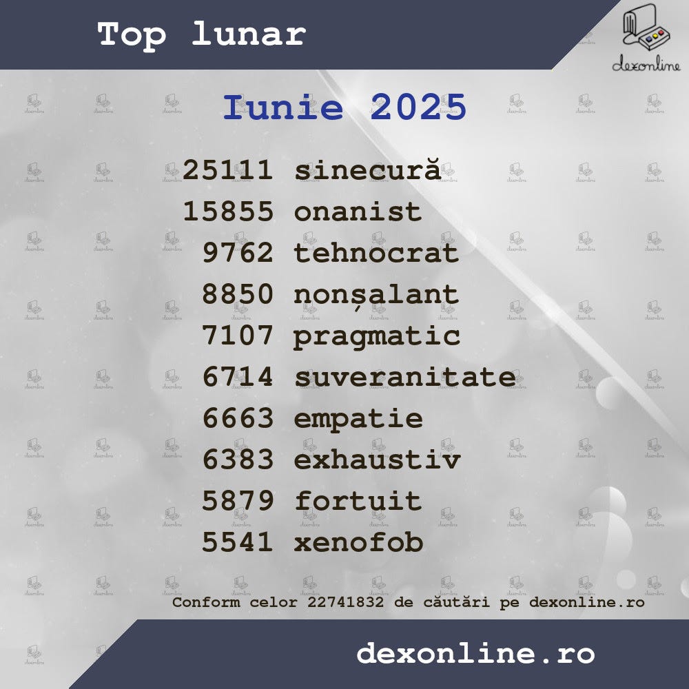Cele mai căutate 10 (zece) cuvinte pe dexonline.ro în luna iunie a acestui an.