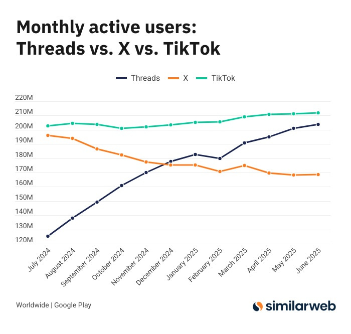 Threads, după ce a depășit X (Twitter) din punctul de vedere al numărului de utilizatori activi lunar, ajunge din urmă o altă platformă de socializare, TikTok.