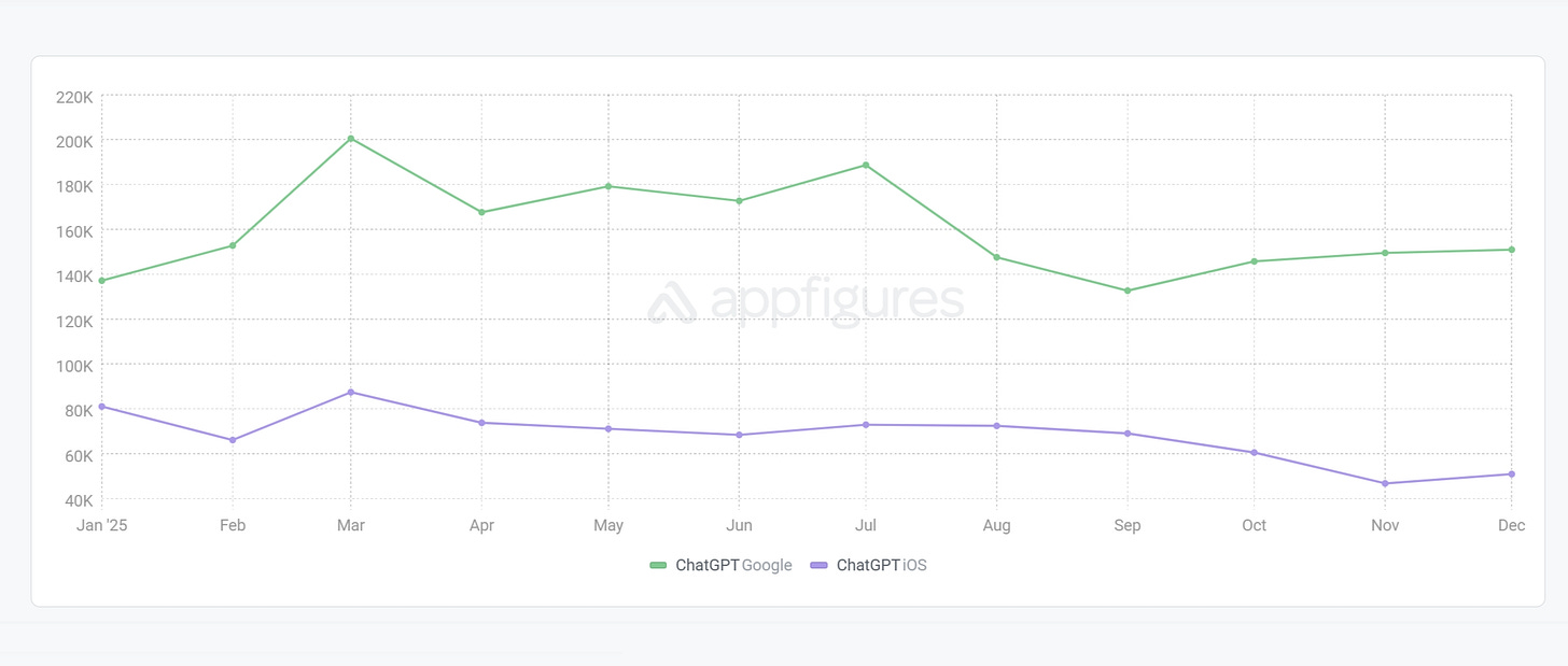 Aplicațiile ChatGPT au primit din partea utilizatorilor de internet din România un număr total de 2.74M de downloads în perioada 1 ianuarie — 31 decembrie 2025 după cum urmează: